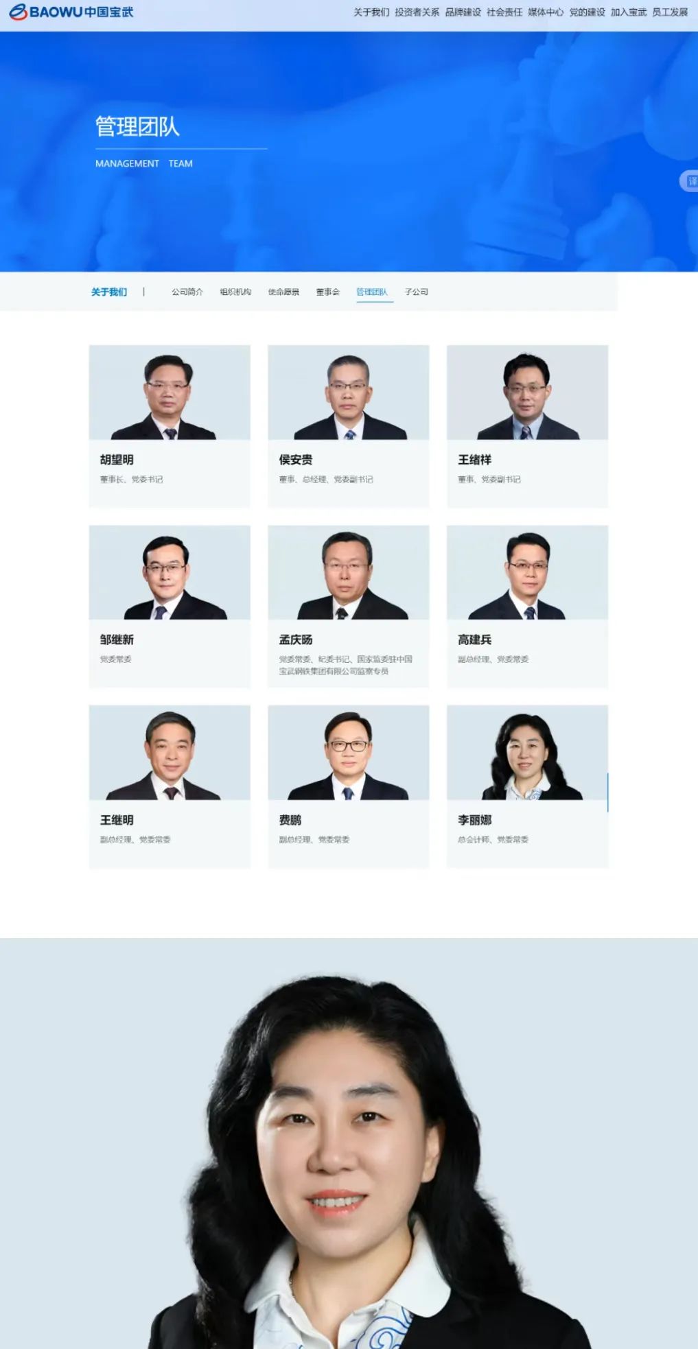 據(jù)中國寶武鋼鐵集團(tuán)有限公司(以下簡稱“寶武鋼鐵集團(tuán)”)官網(wǎng)“管理團(tuán)隊(duì)”欄目最新信息顯示,李麗娜已任集團(tuán)總會計(jì)師、黨委常委。她此前擔(dān)任中國能源建設(shè)股份有限公司黨委常委、總會計(jì)師。