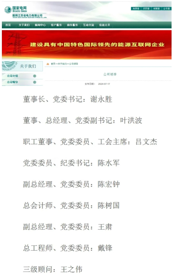 國網(wǎng)江蘇省電力有限公司官網(wǎng)顯示:國網(wǎng)江蘇省電力有限公司原副總經(jīng)理、黨委委員王之偉轉(zhuǎn)為三級(jí)顧問。