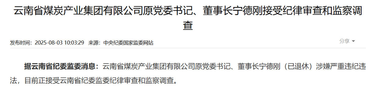 據(jù)云南省紀(jì)委監(jiān)委8月3日消息,云南省煤炭產(chǎn)業(yè)集團(tuán)有限公司原黨委書記、董事長(zhǎng)寧德剛(已退休)涉嫌嚴(yán)重違紀(jì)違法,目前正接受審查調(diào)查。