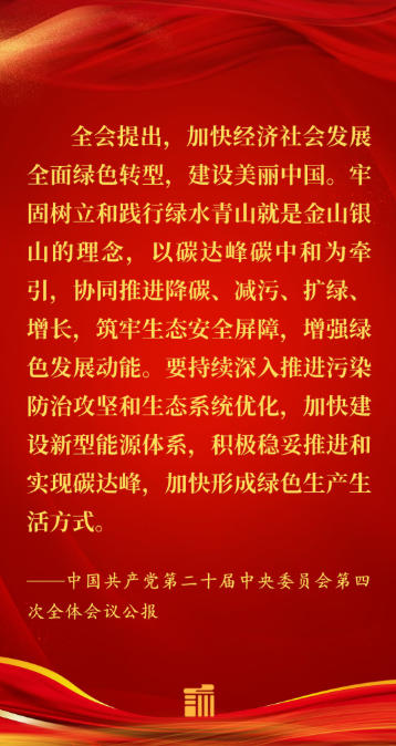 全會提出,加快經(jīng)濟社會發(fā)展全面綠色轉(zhuǎn)型,建設(shè)美麗中國。牢固樹立和踐行綠水青山就是金山銀山的理念,以碳達峰碳中和為牽引,協(xié)同推進降碳、減污、擴綠、增長,筑牢生態(tài)安全屏障,增強綠色發(fā)展動能。要持續(xù)深入推進污染防治攻堅和生態(tài)系統(tǒng)優(yōu)化,加快建設(shè)新型能源體系,積極穩(wěn)妥推進和實現(xiàn)碳達峰,加快形成綠色生產(chǎn)生活方式。