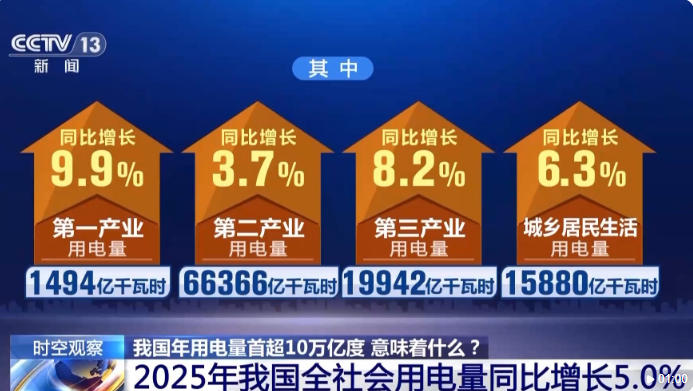 超10萬億度的年用電量,也考驗著一個國家電力系統(tǒng)的供給能力與韌性。2025年,我國通過構(gòu)建清潔低碳的發(fā)電體系、打造高效互聯(lián)的輸電網(wǎng)絡(luò)、完善靈活智能的調(diào)度機(jī)制,實(shí)現(xiàn)了電力的穩(wěn)定可靠供給。10萬億度電究竟用在了哪里?