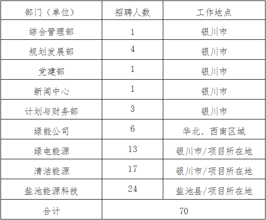 本次招聘總?cè)藬?shù)70人。其中公司本部10人(綜合管理部1人、規(guī)劃發(fā)展部4人、黨建部1人、新聞中心1人、計(jì)劃與財(cái)務(wù)部3人),綠能公司6人,綠電能源13人,清潔能源17人,鹽池能源科技24人。