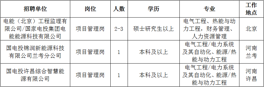 根據(jù)業(yè)務(wù)發(fā)展需要,中國電能所屬企業(yè)電能(北京)工程監(jiān)理有限公司、國家電投集團(tuán)電能能源科技有限公司、國電投錦潤新能源科技有限公司蘭考分公司、國電投許昌綜合智慧能源有限公司面向2023年高校應(yīng)屆畢業(yè)生進(jìn)行公開選聘。