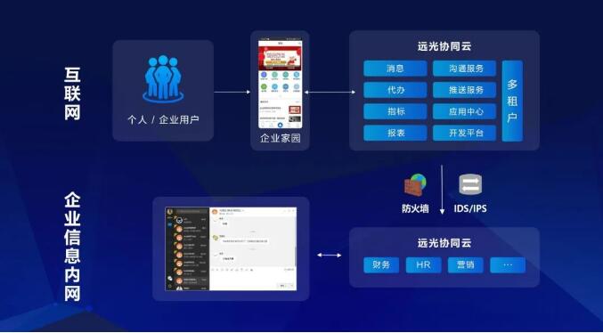 遠光“企業(yè)家園”采用公有云與私有云共存的混合云架構(gòu),即對于企業(yè)商密等級較低的數(shù)據(jù),如消息提醒、待辦提醒等可以通過移動端在外網(wǎng)進行實時訪問,對于企業(yè)內(nèi)部數(shù)據(jù)、商密等級高的數(shù)據(jù),依然保留在本地,通過企業(yè)電腦端才能訪問。充分利用互聯(lián)網(wǎng)應(yīng)用的靈活性、便利性的同時,保證數(shù)據(jù)的安全性、私密性。