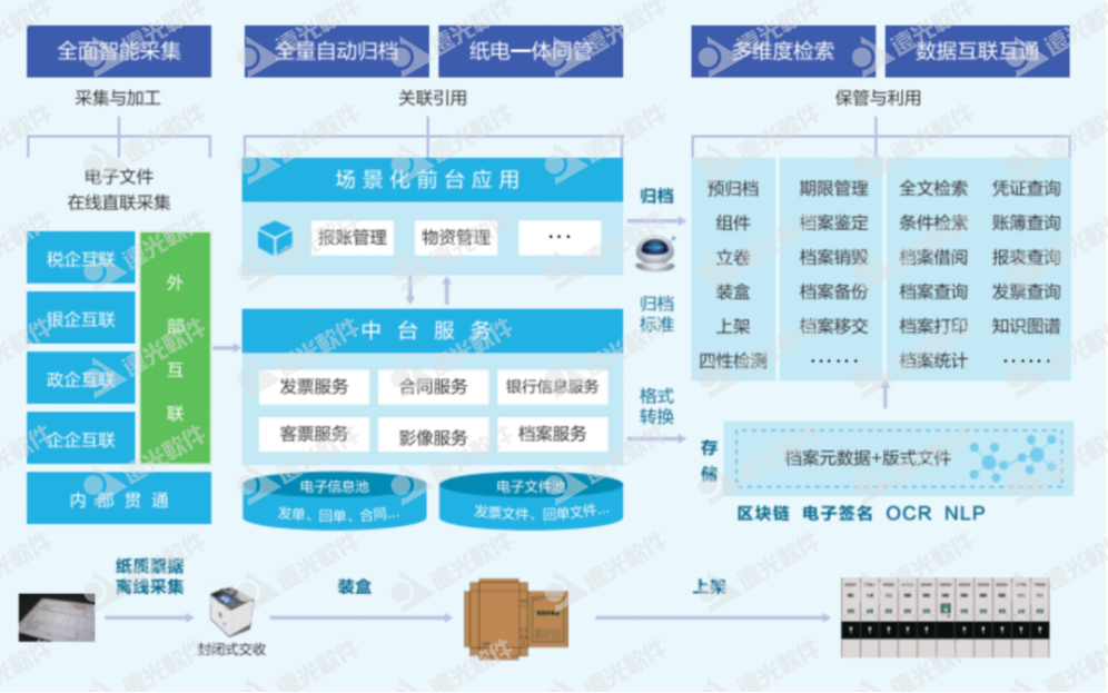 遠光“智慧檔案”是遠光軟件基于在電子檔案多年的研究與實踐,深度融合區(qū)塊鏈、人工智能、大數(shù)據(jù)、邊緣計算、物聯(lián)網(wǎng)等新興技術,精研軟硬一體化整合應用,遵循電子票證管理標準和規(guī)范,將電子檔案系統(tǒng)與智能設備相結合,推出的全新一體化解決方案,滿足了企業(yè)對檔案的全生命周期流程的管理需求,為檔案管理工作進行全面賦能。