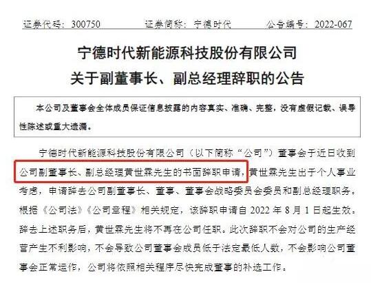 8月1日晚間,寧德時代披露公告稱,公司董事會于近日收到公司副董事長、副總經理黃世霖的書面辭職申請,黃世霖出于個人事業(yè)考慮,申請辭去公司副董事長、董事、董事會戰(zhàn)略委員會委員和副總經理職務。辭去上述職務后,黃世霖將不再在公司任職。