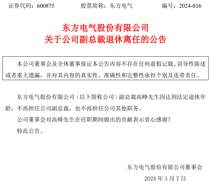 3月7日晚間,東方電氣股份有限公司(簡(jiǎn)稱:東方電氣)發(fā)布關(guān)于公司副總裁退休離任的公告。