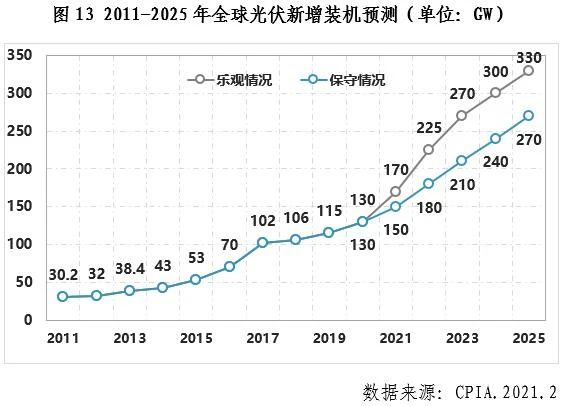 (二)我國光伏市場將進入快速發(fā)展新階段2021年是“十四五”規(guī)劃的開局之年,也是我國光伏發(fā)電進入平價上網(wǎng)的關(guān)鍵之年。2021年我國光伏應用市場將繼續(xù)保持快速增長勢頭,預計新增裝機規(guī)??蛇_55-65GW,其中競價結(jié)轉(zhuǎn)項目10GW左右,戶用市場有望達到15GW,工商業(yè)分布式預計在10GW左右,外送及平價地面電站在20-30GW左右。在“碳達峰、碳中和”目標下, “十四五”期間我國光伏市場將迎來市場化建設高峰,預計國內(nèi)年均光伏裝機新增規(guī)模在70-90GW,有望進一步加速我國能源轉(zhuǎn)型。