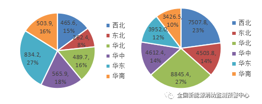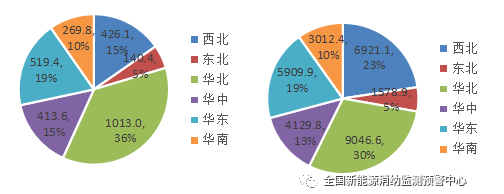 四季度各區(qū)域新增(左)、累計(右)并網光伏發(fā)電裝機(萬千瓦)