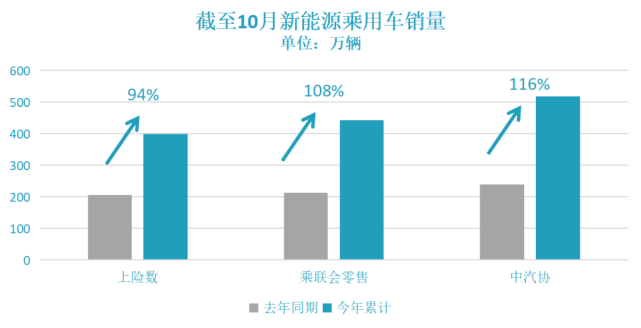 終端統(tǒng)計(jì)的上險(xiǎn)數(shù)更為直接反映了市場(chǎng)狀況,1-10月總上險(xiǎn)新能源乘用車399.47萬(wàn)輛,同比增幅也達(dá)到了94%。