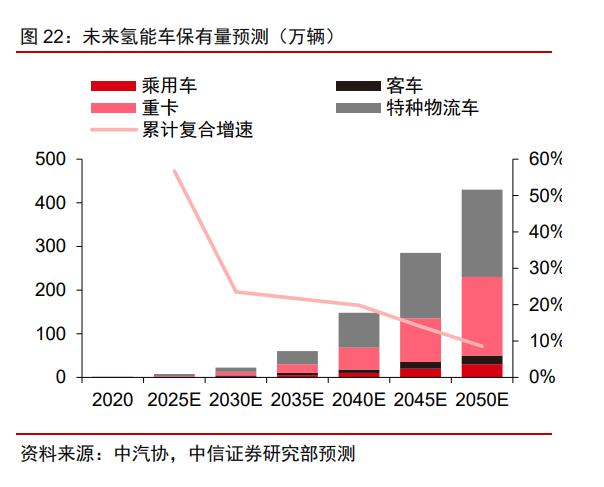 展望“十四五”,國(guó)內(nèi)氫能源車有望完成從產(chǎn)業(yè)導(dǎo)入期到量產(chǎn)的階段,結(jié)合各地方政府的氫能源規(guī)劃,我們預(yù)計(jì)2025年全國(guó)燃料電池車保有量有望達(dá)到8萬(wàn)輛,其中預(yù)計(jì)乘用車、客車、重卡、物流車保有量將分別達(dá)到4500、10000、16000、47500輛左右,相應(yīng)的燃料電池需求預(yù)計(jì)將從目前的0.35GW左右上升至2025年的2.6GW;預(yù)計(jì)2050年燃料電池車保有量將達(dá)430萬(wàn)輛。