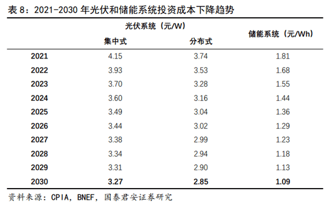目前,各地依據(jù)本地情況出臺配儲比例政策,常見要求配儲10%、2h(0.2wh)。長期來看,配儲規(guī)模的增長彈性取決于光伏和儲能裝置成本的持續(xù)下價,理論上是維持光儲一體化資產(chǎn)的合理IRR。我們按照2030年光伏和儲能的成本測算,配儲0.6wh的IRR可以達到6%。