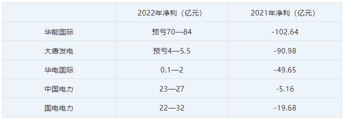 華電國(guó)際預(yù)計(jì)2022年實(shí)現(xiàn)歸母凈利潤(rùn)0.1億元至2億元,較上年同期(重述后)減虧49.92億元到51.82億元。國(guó)電電力發(fā)布業(yè)績(jī)預(yù)告,預(yù)計(jì)2022年全年盈利22億元至32億元,同比上年增加218.55%至272.43%。