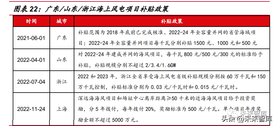 2014-2021 年,海上風電建設享有國家補貼,沿海地區(qū)含稅燃煤電價為 0.37- 0.46 元/度電,而海上風電近海項目補貼后的上網電價在 0.75-0.85 元/度電,高額補貼過去助推了我國海上風電快速發(fā)展。2022 年起國家補貼退坡,開發(fā)商建設意 愿減弱。我們認為國補退出后,我國海上風電主要通過 1)產業(yè)鏈降本;2)地方 補貼支持實現平價并提升項目性價比。