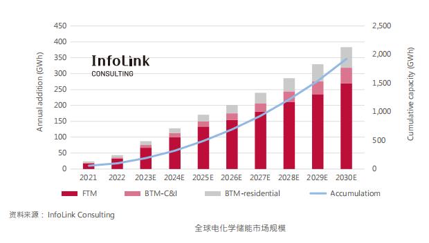 根據(jù)InfoLink資料庫統(tǒng)計,2022年全球電化學(xué)儲能新增16.2GW/44GWh,其中以中國新增約34%占整體成長速度最快,其次為美國、歐洲、日本、韓國、澳大利亞等,光是上述國家2022年儲能新增總和占全球超過市場九成份額,因此累計至2022年底,電化學(xué)儲能全球累計安裝量為41GW/98.8GWh,之中約有16-17GWh搭配光伏系統(tǒng),InfoLink估計光加儲占比將會因政策及再生能源發(fā)展而逐年提升比重,此外,盡管現(xiàn)在儲能增長速度每年已經(jīng)以倍數(shù)成長,估計到2025年國際電芯廠紛紛擴(kuò)產(chǎn)之后,儲能系統(tǒng)會因電池價格下降因而再加速建置速度,預(yù)計2025年全球電化學(xué)儲能市場有望超過100GWh,而2030年全球樂觀有望累積建置 250GWh。