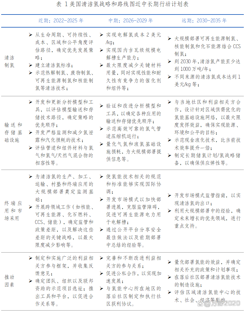 美國是最早發(fā)展氫能的國家,多年來始終將氫能作為重要能源戰(zhàn)略儲備技術(shù),持續(xù)支持氫能全產(chǎn)業(yè)鏈技術(shù)研發(fā),并加快示范創(chuàng)建和戰(zhàn)略部署,以期實(shí)氫能產(chǎn)業(yè)規(guī)模化發(fā)展。2021年7月美國能源部(以下簡稱“DOE”)宣布投資5250萬美元用于綠氫技術(shù)的研發(fā),這筆資金將惠及多項(xiàng)氫能研發(fā)項(xiàng)目,旨在十年內(nèi)將氫能成本降低80%,達(dá)到每千克1美元。11月DOE又發(fā)布《碳中性氫能技術(shù)基礎(chǔ)科學(xué)》研發(fā)指南,明確了高效新型電解水制氫、氫機(jī)理等4個優(yōu)先研發(fā)方向。2022年2月,DOE下屬化石能源和碳管理辦公室宣布2800萬美元的聯(lián)邦資金,用于推動綠氫作為一種無碳燃料用于交通、工業(yè)和電力生產(chǎn)。2022年11月,DOE發(fā)布《國家清潔氫能戰(zhàn)略和路線圖(草案)》,制定2022-2035年近、中、長期清潔氫能發(fā)展行動時間表,如表1所示,明確在制氫、儲氫、運(yùn)氫及終端應(yīng)用的各階段發(fā)展目標(biāo)。此外,美國于2023年6月發(fā)布首個國家能源戰(zhàn)略規(guī)劃路線圖。