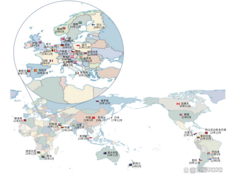 氫能是一種來源豐富、綠色低碳、應(yīng)用廣泛的二次能源,正逐步成為全球應(yīng)對氣候變化和能源轉(zhuǎn)型發(fā)展的重要抓手。隨著全球新一輪科技革命和產(chǎn)業(yè)變革蓬勃興起,新興能源技術(shù)以前所未有的速度加快迭代,助推氫能產(chǎn)業(yè)快速發(fā)展。據(jù)國際氫能源委員會預(yù)測,到2030年全球氫能領(lǐng)域投資總額將達(dá)5000億美元,而2050年全球氫能產(chǎn)業(yè)鏈產(chǎn)值將超過2.5萬億美元。在此背景下,目前已有超過40多個國家和地區(qū)制定了國家氫能發(fā)展戰(zhàn)略,積極培育氫能及燃料電池技術(shù)攻關(guān)和產(chǎn)業(yè)發(fā)展,如圖1所示。在推動氫能發(fā)展的過程中,各國根據(jù)自身資源稟賦、產(chǎn)業(yè)基礎(chǔ)、市場訴求等因素,分階段、分領(lǐng)域推進(jìn)氫能發(fā)展戰(zhàn)略,并在實(shí)踐中不斷完善,已經(jīng)形成各具特色的發(fā)展模式。