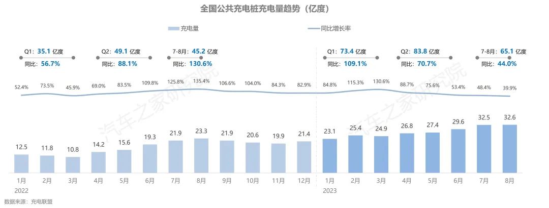 從公樁使用情況上看,隨著新能源汽車保有量的快速增長,公樁充電量持續(xù)增長,今年1-8月充電量已超過去年全年充電量之和。今年新能源汽車銷量持續(xù)高漲,滲透率不斷提高,隨之帶來的是新能源用車出行需求快速增長,使得全國公共充電樁充電量在7、8兩個月內(nèi)連續(xù)超越30億度大關(guān)。