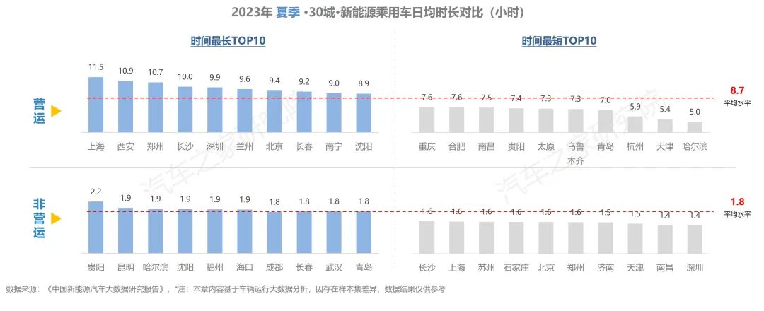 在日均時長方面,夏季營運車輛的行駛時間與春季相似,每日行駛6-10小時依舊占比最高,是大部分純電運營車輛車主每日工時。此外,行駛不足2小時與超過10小時的車主占比均在增加。非營運車輛夏季每天行駛的時長集中在1-4小時,其占比超過六成。非營運車輛每天行駛的1-2小時的車輛占比下降較多,而向兩側(cè)分流。