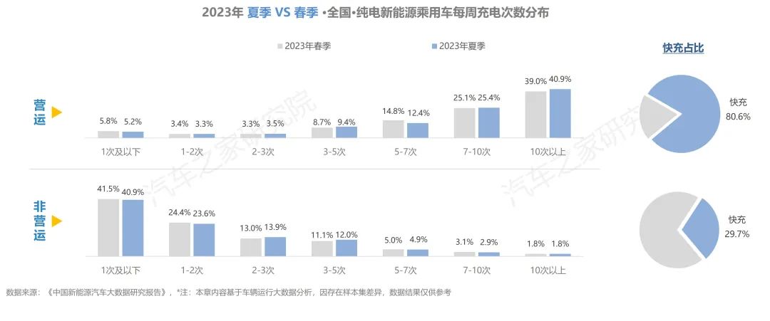 純電營運車輛每周充電超過7次的占比超過60%,且在所有的補能行為中,使用快充的占比高達80%。非營運車輛中超四成的車輛,每周僅充電1次,選擇快充方式補能的占比不足30%。