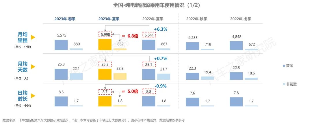與去年同期相比,純電車輛在行駛里程有所增加,在出行天數(shù)與行駛時長方面,同去年夏季相比大體持平。而從不同車輛性質(zhì)對比上看,營運車輛的使用強度遠超非營運車輛,兩者在行駛里程方面相差超6倍,在日均時長則亦有近5倍的差距。