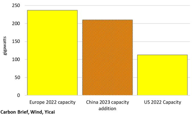 預(yù)計(jì)中國今年的太陽能發(fā)電量將增加210千兆瓦(圖3),接近美國2022年產(chǎn)能的兩倍,約為歐洲2022年產(chǎn)能的90%。