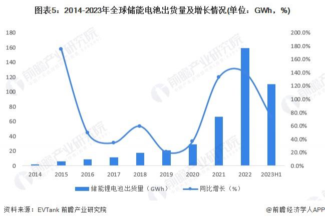 全球電化學儲能裝機規(guī)模的持續(xù)上漲帶動儲能電池出貨量上漲,根據(jù) EVTank 披露的數(shù)據(jù),2014-2022 年,全球儲能電池 ( 主要為儲能鋰離子電池 ) 出貨量增長速度較快,2022 年,全球儲能鋰離子電池總體出貨量為 159.3GWh,同比增長 140.3%。2023 年上半年,全球儲能電池出貨量達到 110.2GWh,同比增長 73.4%,