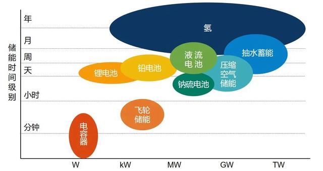 各類儲(chǔ)能在放電時(shí)間和容量性能的對(duì)比圖