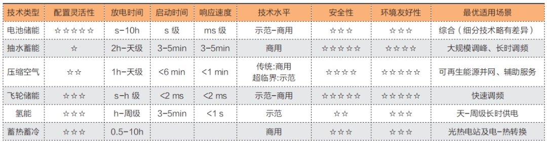 綜合分析各類(lèi)儲(chǔ)能的技術(shù)特點(diǎn),從配置靈活性上看,電池儲(chǔ)能配置靈活性及可擴(kuò)展性最為優(yōu)異,抽水蓄能及傳統(tǒng)洞穴式壓縮空氣配置靈活性最差;從儲(chǔ)能發(fā)電時(shí)長(zhǎng)上看,氫能發(fā)電時(shí)間可達(dá)周級(jí),抽水蓄能及傳統(tǒng)洞穴式壓縮空氣次之,電池儲(chǔ)能放電時(shí)間基本在s-10h之間;從啟動(dòng)及響應(yīng)速度上看,飛輪、超級(jí)電容和電池儲(chǔ)能技術(shù)基本在ms-s級(jí)別,適用于快速響應(yīng)的調(diào)頻領(lǐng)域;從安全性上看,機(jī)械儲(chǔ)能安全性最為優(yōu)異,電化學(xué)儲(chǔ)能的安全性相對(duì)較弱。