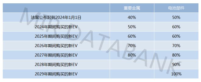 其中電池關(guān)鍵礦物原材料國(guó)產(chǎn)率部分規(guī)定:可得到補(bǔ)貼的新能源汽車的電池,其包含的適用關(guān)鍵礦物*中開(kāi)采、加工或回收于美國(guó)及其自貿(mào)伙伴國(guó)家*的,需要逐年達(dá)到規(guī)定的百分比,否則該部分補(bǔ)貼不可獲得。電池部件國(guó)產(chǎn)率部分規(guī)定:電池中在北美制造或組裝的電池組件占整體電池成本的百分比需要逐年達(dá)到一定規(guī)定的百分比才能達(dá)標(biāo),獲得相應(yīng)部分的補(bǔ)貼。