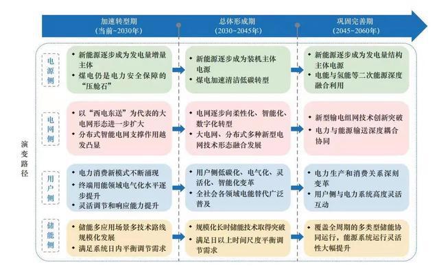 《藍皮書》指出,以2030年、2045年、2060年為新型電力系統(tǒng)構建戰(zhàn)略目標的重要時間節(jié)點,制定新型電力系統(tǒng)“三步走”發(fā)展路徑,即加速轉(zhuǎn)型期(當前至2030年)、總體形成期(2030年至2045 年)、鞏固完善期(2045年至2060年),有計劃、分步驟推進新型電力系統(tǒng)建設的“進度條”。