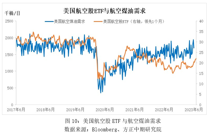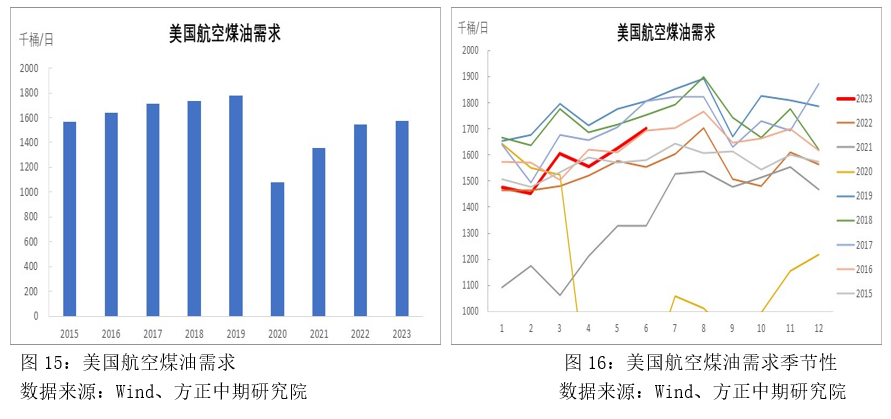 美國航空煤油消費與美國航空業(yè)景氣度有緊密聯(lián)系。美國航空股ETF一定程度上能反應美國航空業(yè)景氣度,2020年疫情導致航空出行需求驟降,美國航空業(yè)遭遇重挫,航空股ETF大幅走跌,相應的,美國航空煤油消費也顯著下降,而隨著美國出行限制的逐步放松,美國航空業(yè)景氣度也在逐步回升,進而帶動美國航空煤油快速回升,但2021年二季度以后,受經(jīng)濟環(huán)境低迷影響,美國航空股ETF再度走跌,直至2022年9月份才觸底回升,而在過去1年,美國航空煤油消費整體也隨著美國航空業(yè)的進一步恢復而走強。另外,我們從OAG的數(shù)據(jù)來看,當前美國航空運力已經(jīng)超過2019年同期水平約16%,同時2023年上半年美國航空實際客運量也已經(jīng)回到疫情前水平,這對美國航空煤油消費形成明顯支撐。2023年上半年美國航空煤油消費量達到158萬桶/日,較2022年小幅增長了3萬桶/日,但較2019年下降了20萬桶/日,降幅為11%。