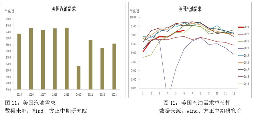 美國汽油消費與美國汽車保有量及國內汽車銷量的變化有直接關系,同時汽車銷售增量相應領先于汽油需求增長。2000年以后,美國國內汽車銷量呈現(xiàn)明顯的下滑趨勢,至2009年達到歷史低點,此后保持增長直至2014年,2015年以后美國汽車銷量再度出現(xiàn)下降,至今仍處在歷史低位水平。相應的,美國汽油需求在2007年以后開始下降,但隨著此后汽車銷量的增加,2012年以后美國汽油需求再度出現(xiàn)增長,但伴隨著美國汽車銷量的再度下降,在2017年年中美國汽油消費達到峰值水平后,開啟了緩慢下降趨勢。2023年上半年美國汽油消費量達到884萬桶/日,較2022年小幅增長了14萬桶/日,但較2019年下降了50萬桶/日,降幅為5%。