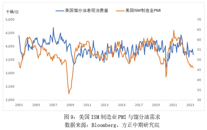 美國柴油消費與美國制造業(yè)形勢息息相關,通過對比發(fā)現(xiàn),美國餾分油需求與美國ISM制造業(yè)PMI趨勢基本保持一致,但存在滯后關系。其中,2008年金融危機以及2020年疫情均導致美國制造業(yè)PMI大幅下滑,并帶動美國餾分油需求明顯走弱,但2021年美國制造業(yè)再度進入下行周期,2022年美國餾分油需求也開始走弱,2023年美國餾分油消費量達到381萬桶/日,較2022年下降了10萬桶/日,較2019年下降了26萬桶/日,降幅為6.5%。從歷史數(shù)據(jù)來看,排除極端情況,美國制造業(yè)變化往往要領先于美國餾分油需求變化近1年時間。