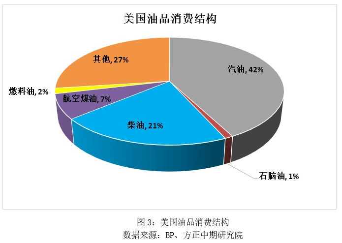 美國是全球第一大石油消費國,根據(jù)BP的數(shù)據(jù),2005年美國石油消費達到2053萬桶/日的峰值水平,此后石油消費量呈下滑趨勢,即便2012年之后的7年時間再度出現(xiàn)增長,但仍未超過2005年的峰值水平。而美國石油消費在全球石油消費總量中占比達到20%左右,而在美國石油消費結構中,汽油消費占比最多,達到42%左右,其次是柴油和航空煤油,占比分別為21%和7%左右,但隨著美國人均汽車保有量的逐步飽和以及新能源汽車的進一步發(fā)展,美國汽油消費占比預計將延續(xù)下滑趨勢。