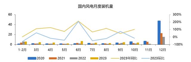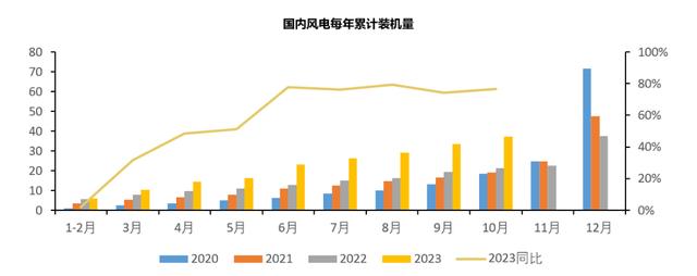 根據(jù)最新10月風電裝機數(shù)據(jù),2023年1-10月,國內(nèi)新增風電裝機37.31GW,同比增長76%,單10月新增裝機達到3.83GW,同比增長102%,環(huán)比下降16%。可以看出無論單月裝機量還是累計規(guī)模都要遠優(yōu)于去年,側(cè)面印證國內(nèi)風電可能迎來了拐點。