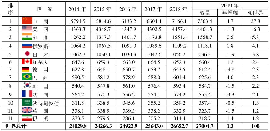 電力可來自非再生能源發(fā)電和再生能源發(fā)電。表中2010~2015年數(shù)據(jù)來自國際能源署(IEA)《Key world energy statistics》報告的數(shù)據(jù),而2016~2019年的數(shù)據(jù)來自《BP Statistical Review of World Energy June 2017-2020》。