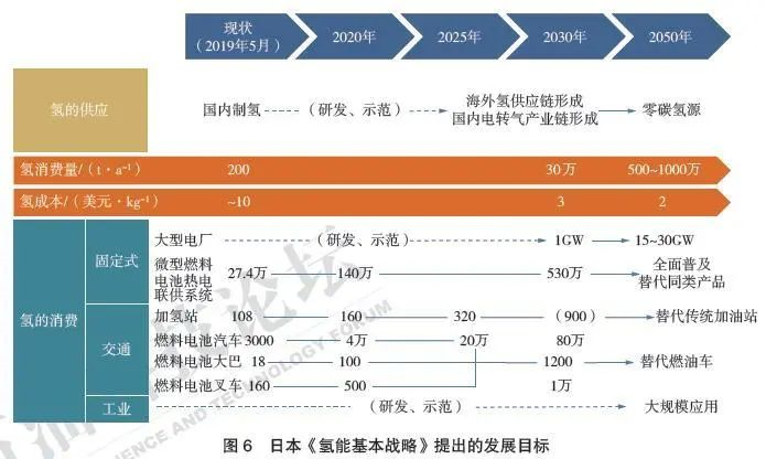 在能源消費(fèi)方面,2012—2016年,日本能源消費(fèi)總量減少了6.1%,接近實(shí)現(xiàn)2030年節(jié)能目標(biāo)所需的平均速度。日本能源轉(zhuǎn)型以氫能規(guī)模化利用為顯著特色和重要抓手,將氫能與電力和熱能并列定位為核心二次能源,并提出建設(shè)“氫能社會(huì)”的愿景,希望通過氫燃料電池實(shí)現(xiàn)氫能在家庭、工業(yè)、交通甚至全社會(huì)領(lǐng)域的應(yīng)用。日本在《氫能基本戰(zhàn)略》提出的主要發(fā)展目標(biāo)詳見圖6。