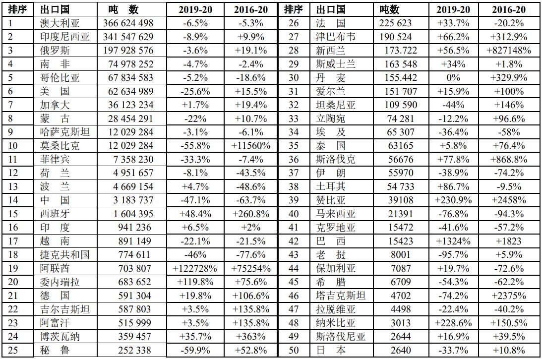 2020年煤出口國有50位,占全球出口煤量的99.6%。