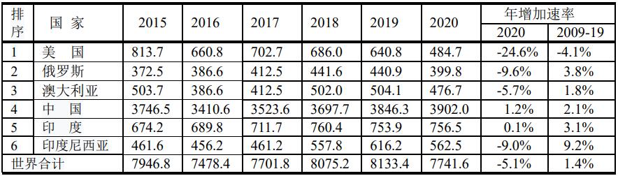 全球原煤可采儲量前6位國家的產(chǎn)量(單位:百萬噸)