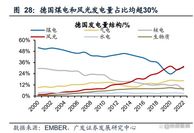 新能源滲透率提升的同時(shí),德國(guó)保留一定火電裝機(jī)用于調(diào)峰。與丹麥不同,德國(guó)在 風(fēng)光發(fā)電量提升的同時(shí),始終保留一定的煤電、并新增一批氣電裝機(jī)解決風(fēng)光消納 問題,這與德國(guó)資源稟賦有關(guān),德國(guó)是歐盟最大的煤炭產(chǎn)出國(guó),2021年德國(guó)煤炭產(chǎn)量占?xì)W盟的38%,這與我國(guó)頗為相似。2000-2021年德國(guó)煤電和氣電裝機(jī)占比從63.3% 降低至29.2%,風(fēng)光裝機(jī)占比從6.0%提升至58.7%,新增裝機(jī)主要由風(fēng)光貢獻(xiàn)。發(fā)電 量結(jié)構(gòu)來看,2000-2021年德國(guó)煤電和氣電發(fā)電量占比從61.0%降低至44.6%,風(fēng)光 發(fā)電量占比從1.6%提升至28.2%,火電仍然保持了一定比例用于調(diào)峰。
