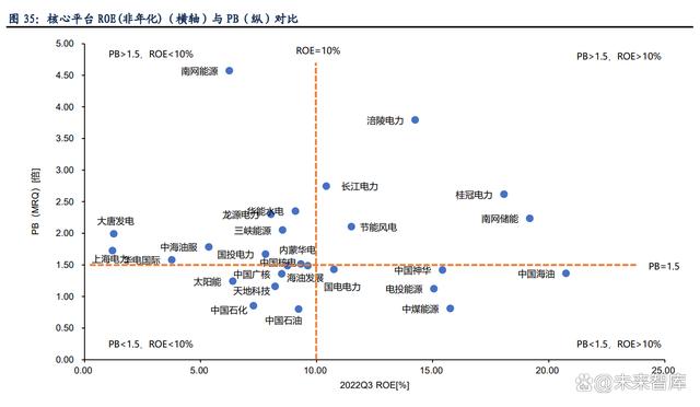 在 PB-ROE 模型中,全部 A 股上市公司的數(shù)據(jù)如下:2023/3/30 的 PB 為 1.57(MRQ), 2022 前三季度 ROE 為 8.99%。因此,我們將 PB=1.5,roe =10%作為標(biāo)準(zhǔn)進行篩選,對 PB 估值較低且資產(chǎn)收益率較高的核心平臺分為以下三類: (1) 第一類,ROE 大于 10%且 PB 小于 1.5 的公司:中煤能源,中國海油,中國神華, 電投能源,國電電力。 (2) 第二類,PB 略大于 1.5 但 ROE 表現(xiàn)良好的公司:節(jié)能風(fēng)電。 (3) 第三類,ROE 略低于 10%且 PB 較低的公司:中國石油,中國廣核,中國石化,海 油發(fā)展,天地科技,中國核電。 從中長期來看,二級市場對股票的估值水平通常會隨著公司盈利能力的增強而上升,即 PB 與 ROE 理論上應(yīng)當(dāng)呈現(xiàn)正相關(guān)關(guān)系。我們認為,以上公司是目前處于低估狀態(tài)的能源央企 核心平臺,估值修復(fù)空間較大。