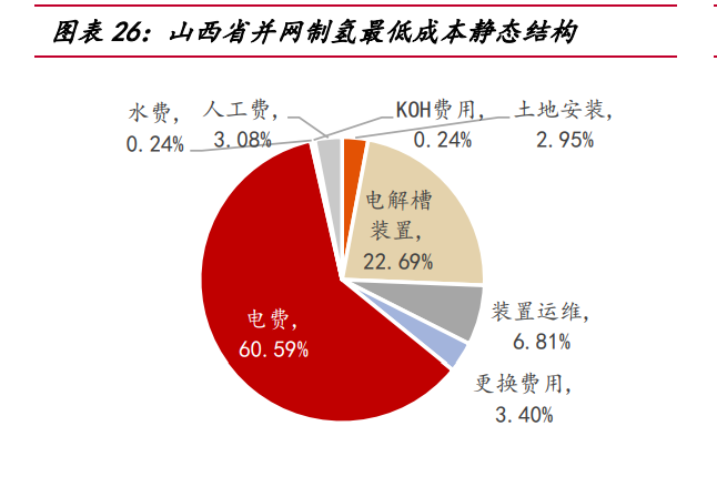山西省經(jīng)濟(jì)利用小時(shí)數(shù)為 1915 小時(shí),并網(wǎng)制氫單位成本最低:截止 2022Q3,山 西省風(fēng)電光伏裝機(jī)量占比位列全國第 14,但由于負(fù)荷較少,山西省低電價(jià)小時(shí)數(shù)在 五個省份中較為顯著, 0~0.05 元/kWh 共計(jì) 1341 小時(shí),0.3~0.35 元/kWh 共計(jì) 1219 小時(shí),低電價(jià)優(yōu)勢明顯。經(jīng)過我們的測算,當(dāng)利用小時(shí)數(shù)為 1915 小時(shí),綜合電價(jià) 0. 1868 元/kWh,山西制氫成本最低為 15.2 元/kg,考慮氧氣售后沖減費(fèi)用,制氫成本 下降至 9.6 元/kg。山西省并網(wǎng)制氫成本結(jié)構(gòu)中,因現(xiàn)貨市場低電價(jià)優(yōu)勢顯著,電費(fèi) 占比相對較低,僅 60.59%,電費(fèi)之中,電能量價(jià)格占 42%,輸配容量價(jià)格占 36%。