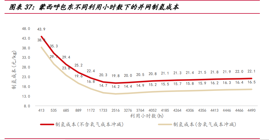 蒙西經(jīng)濟(jì)利用小時(shí)數(shù)為 2516 小時(shí),成本有較大下降空間:蒙西低電價(jià)小時(shí)數(shù)相 對分散,-0.05~0 元/kWh 共計(jì) 408 小時(shí),0.25~0.3 元/kWh 共計(jì) 561 小時(shí),整體上并 網(wǎng)制氫成本劣于山西和甘肅省,但優(yōu)于山東和廣東省。當(dāng)利用小時(shí)數(shù)為 2516 小時(shí), 綜合電價(jià) 0.308 元/kWh,蒙西并網(wǎng)制氫成本最低為 19.75 元/kg,考慮氧氣售后沖減 費(fèi)用,制氫成本下降至 14.15 元/kg。蒙西并網(wǎng)制氫成本結(jié)構(gòu)中,電費(fèi)占比 76.84%。 電費(fèi)之中,電能量價(jià)格占 71%,輸配容量價(jià)格占 14%??紤]到蒙西有豐富的風(fēng)光發(fā)電 資源,未來風(fēng)光發(fā)電滲透率提升空間較大,電價(jià)分布或?qū)⑦M(jìn)一步左偏,降低并網(wǎng)制氫 成本。