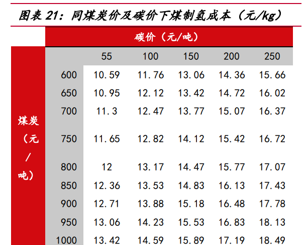 若考慮碳排放價(jià)格,化石能源制氫經(jīng)濟(jì)性進(jìn)一步下降。根據(jù) IEA,煤制氫路線 1kg 氫氣產(chǎn)生約 26kg 二氧化碳、天然氣制氫路線 1kg 氫氣產(chǎn)生約 10kg 二氧化碳,按照當(dāng) 前中國碳排放價(jià)格為 55 元/噸計(jì)算,考慮碳價(jià)后煤制氫、天然氣制氫成本將分別達(dá)到 12.7 元/kg、22.3 元/kg,在碳減排壓力下,碳配額發(fā)放或?qū)⑹站o,推動碳價(jià)上行, 當(dāng)碳價(jià)上漲至 200 元/噸時(shí),煤制氫、天然氣制氫成本將分別達(dá)到 16.5 元/kg、23.8 元/kg,電解水制氫相對化石能源制氫或?qū)⒏呓?jīng)濟(jì)優(yōu)勢。