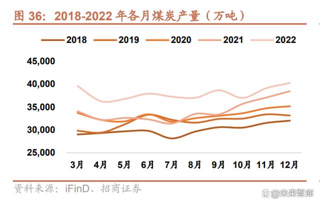 在保供政策的支持下,2022 年國(guó)內(nèi)煤炭供應(yīng)在進(jìn)口煤炭?jī)r(jià)格暴漲的情況下基本維持穩(wěn)定。2022 年,全國(guó)煤炭產(chǎn)量 45.6 億噸,同比增長(zhǎng) 10.6%,比去年增加 4.4 億噸,創(chuàng)歷史新高。2022 年各個(gè)月煤炭產(chǎn)量在近五年均為最高。進(jìn)口 煤炭 2.93 億噸,同比增長(zhǎng) 43.34%,其中 8-12 月份煤炭進(jìn)口量遠(yuǎn)高于往年同期水平。庫(kù)存方面,2022 年全國(guó)煤炭庫(kù) 存由 1 月的 1945 萬噸增長(zhǎng)到年末的 2057 萬噸,增長(zhǎng) 5.7%。港口庫(kù)存上,秦皇島港、黃驊港煤炭庫(kù)存 2022 年內(nèi)均 有上升,其中秦皇島港年內(nèi)最高庫(kù)存達(dá)到 592 萬噸,相較于年初增長(zhǎng) 31.8%。內(nèi)陸省份上,東北、華東、西南、西北 煤炭庫(kù)存在年內(nèi)均有上漲,六大發(fā)電集團(tuán)(國(guó)家電投、華能集團(tuán)、國(guó)家能源集團(tuán)、華電集團(tuán)、大唐集團(tuán)、三峽集團(tuán)) 煤炭庫(kù)存在年末達(dá)到 1206.8 萬噸,較年初增長(zhǎng) 3.8%。