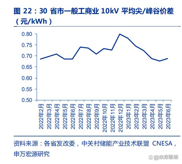 平均峰谷價(jià)差逐漸拉大,為工商業(yè)儲(chǔ)能套利提供可能性。2021 年 7 月 26 日,國(guó)家發(fā) 改委發(fā)布《關(guān)于進(jìn)一步完善分時(shí)電價(jià)機(jī)制的通知》,各省響應(yīng)出臺(tái)拉大峰谷價(jià)差。根據(jù) CNESA 數(shù)據(jù),2022 年全國(guó) 30 省市平均峰谷價(jià)差已達(dá)到 0.70 元/kWh。自 2023 年以來(lái), 峰 谷 價(jià) 差 進(jìn) 一 步 拉 大 , 全 國(guó) 30 省 份 1-6 月 平 均 峰 谷 價(jià) 差 達(dá) 0.78/0.75/0.72/0.69/0.68/0.69 元每度,除 4 月和 5 月以外,其他月份峰谷價(jià)差較 2022 年均有所上漲。