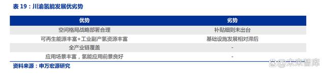 當前,氫能尚處于商業(yè)導入期,氫能產(chǎn)業(yè)的發(fā)展有三個環(huán)節(jié)——上游制儲運、中游燃料電池核心零部件、下游應用端,各重點城市群在氫能建設的道路上尚在突破阻礙,蓄力布局中。川渝地區(qū)在地理位置、氫能資源、產(chǎn)業(yè)鏈體系建設等方面優(yōu)勢巨大,申報此次示范城市群成功可能性極大。川渝地理位置優(yōu)越,空間格局戰(zhàn)略部署合理,形成“一軸、一港、一區(qū)、三路”的“1113”發(fā)展格局。并且,川渝地區(qū)可再生能源豐富,擁有得天獨厚的發(fā)展優(yōu)勢,同時,在成都市,煤化工廠分布密集,副產(chǎn)氫資源頗豐,導致上游制氫成本低。除此之外,川渝氫能產(chǎn)業(yè)制造實力強,現(xiàn)已掌握氫燃料電池、氫源制備、加氫儲氫裝備等領域核心技術,聚集產(chǎn)業(yè)鏈企業(yè)及科研院所200余家,成為了國內(nèi)氫能產(chǎn)業(yè)鏈基礎較為完整的地區(qū)之一。在應用端,川渝地區(qū)應用氫能應用前景良好,截止到2021年底,成渝地區(qū)實現(xiàn)了440輛的燃料電池汽車的產(chǎn)業(yè)化示范應用,配套建成了15座加氫站。