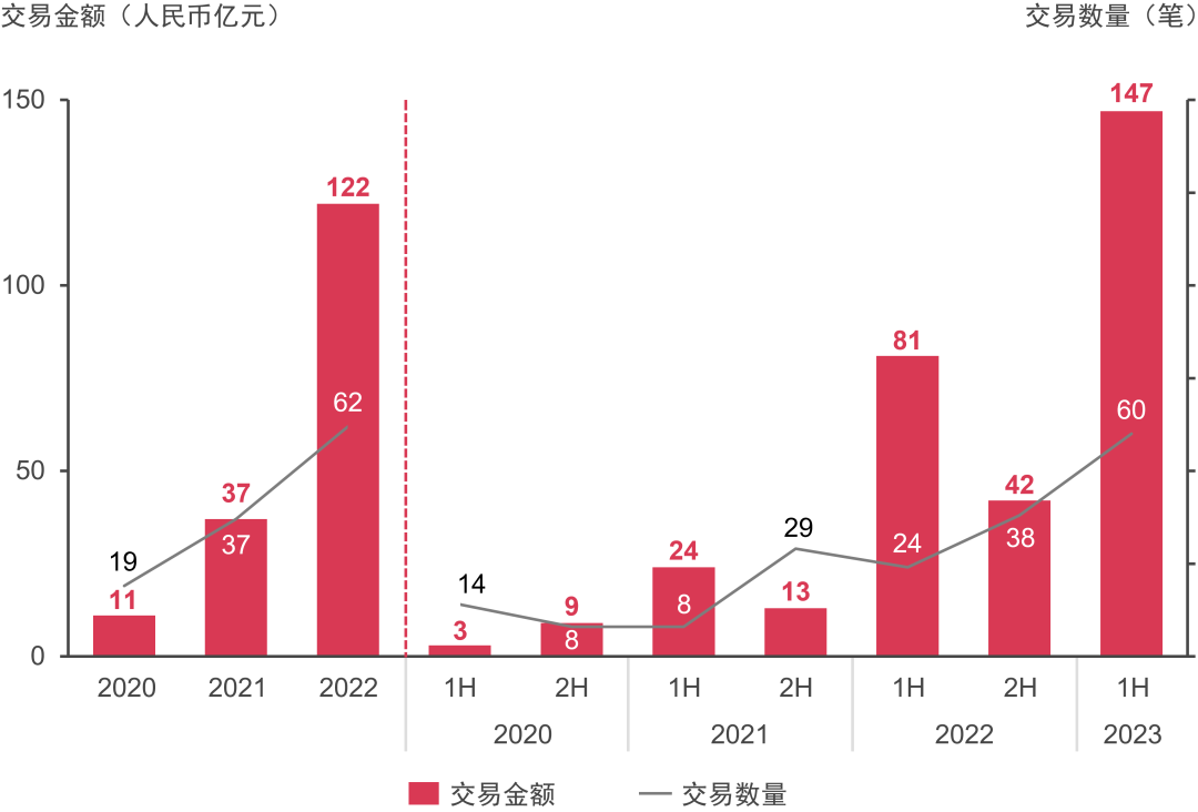 2020年至2023年上半年基礎設施交易金額及數(shù)量