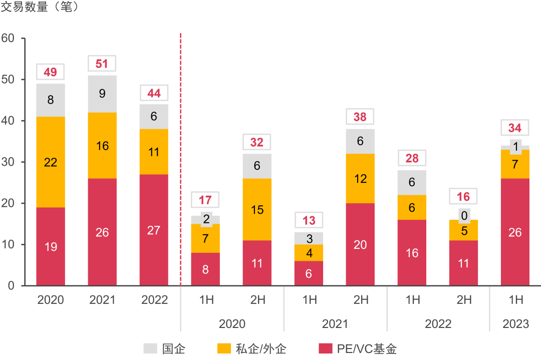 國企整體投資熱度有所下降,上半年僅有兩筆交易;顯示出國企對于行業(yè)成熟度提高后的投資謹慎性。